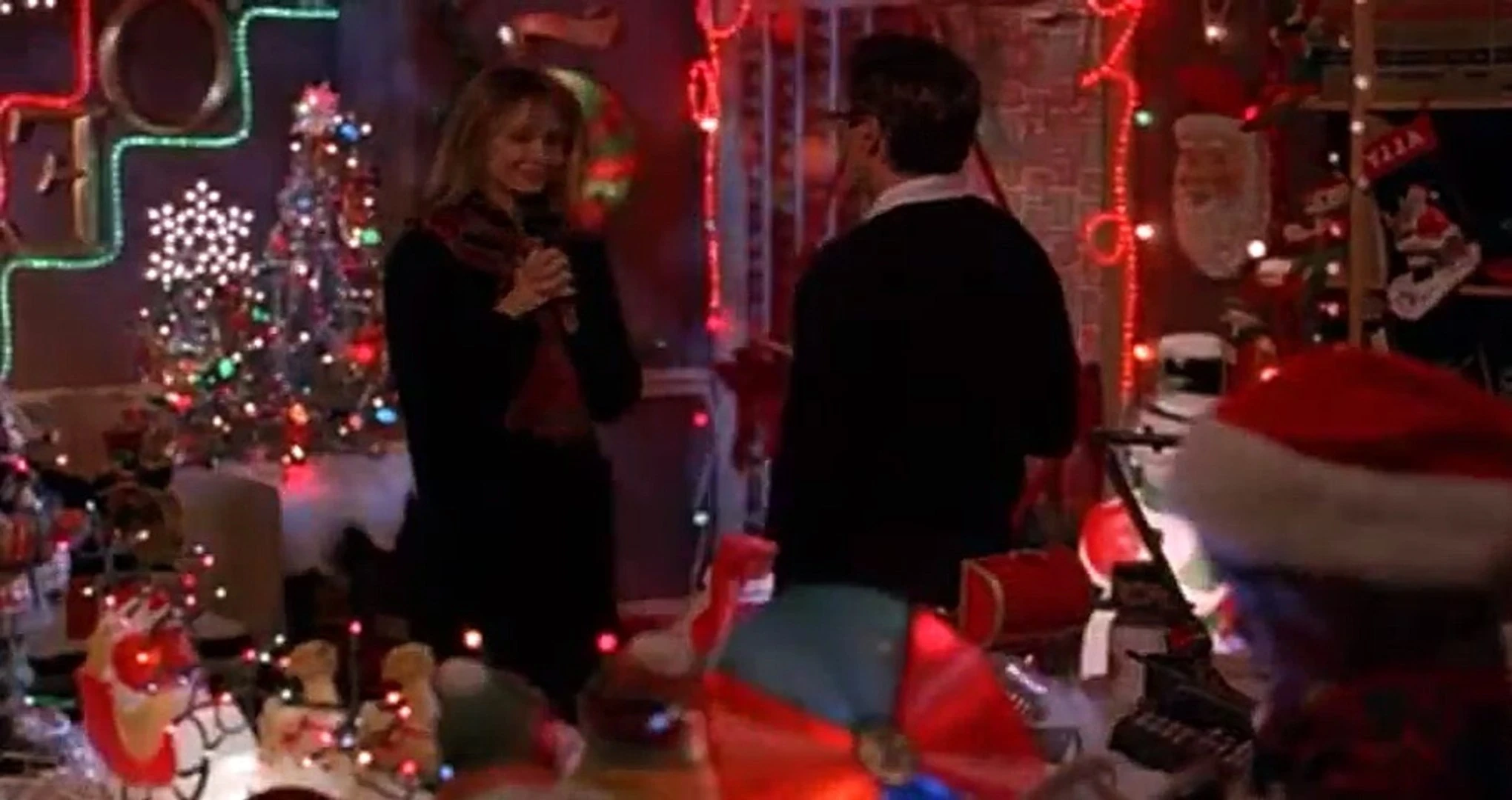 Marks explains to Elaine that he is not on the rebound. He enjoys Elaine's company and would like for her to attend the Christmas party with him. She says, "How do I know that you won't be ashamed of my promiscuity?" He says he won't. She asks him if he would be ashamed if she wore her Vi-Bra and demonstrates to Mark how she made some "holiday adjustments" to it. She turns it on and the bra plays bell sounds in the tune of "Jingle Bells" and moves up and down. Mark looks shocked.